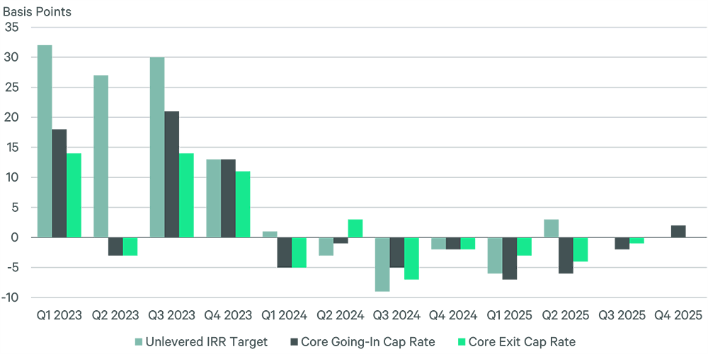 The spread between going-in and exit cap rates for core assets narrowed to 20 basis points, well below the typical historical range of 50–60 basis points. CBRE expects this spread to widen gradually over the next two years as going-in cap rates compress more than exit cap rates.